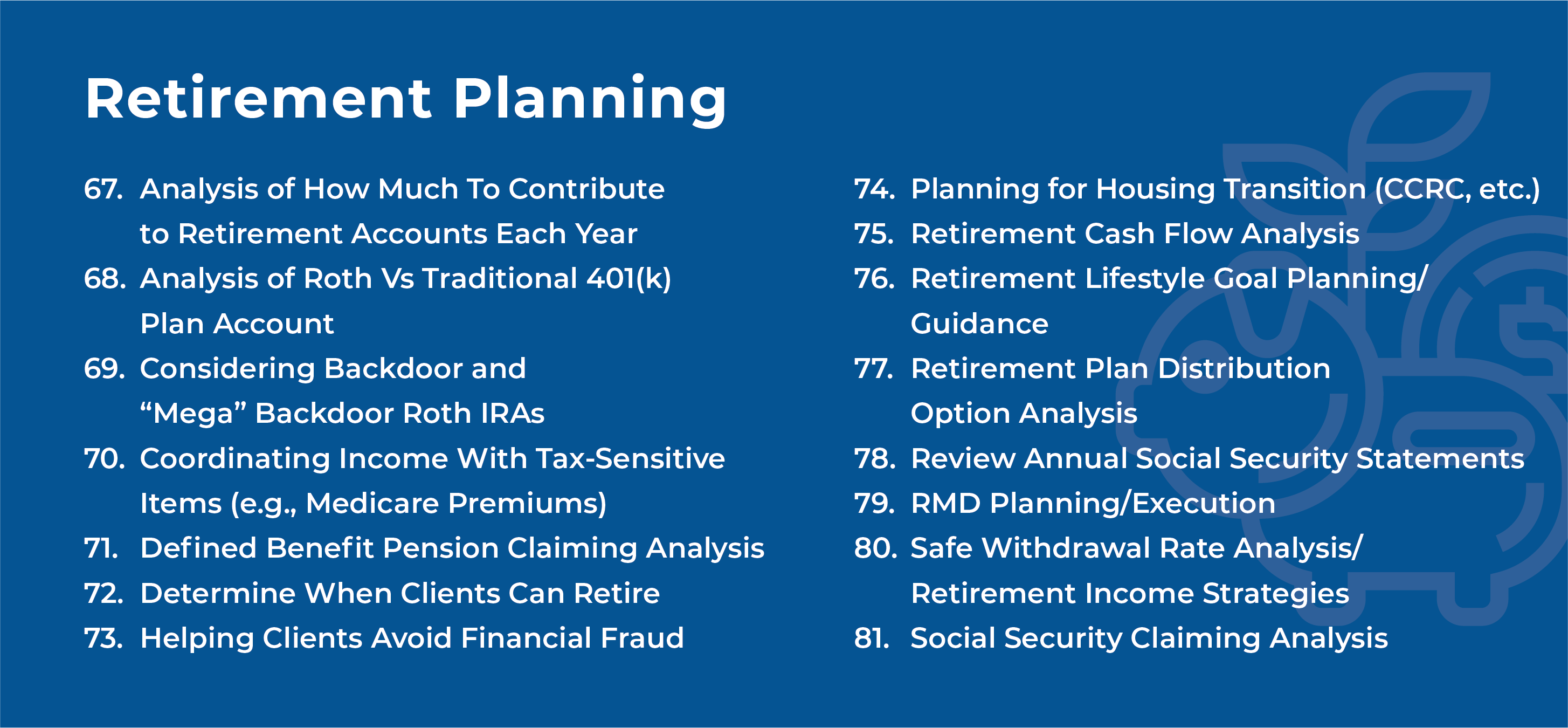 Many of these value-adds begin well before the client retires, such as whether contributions to traditional or Roth accounts would be optimal in a given year and reviewing their annual Social Security statement.