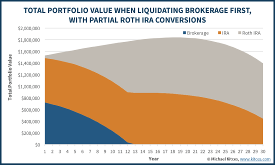 Another benefit of the approach of spending taxable/brokerage accounts first while doing partial Roth conversions is that if there’s enough funds in the brokerage accounts that the IRA may not be needed at all, doing partial Roth conversions still helps to maximize long-term wealth, by minimizing the future impact of Required Minimum Distribution (RMD) obligations.