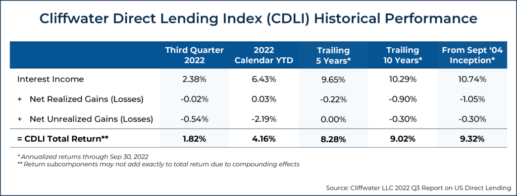 The Cliffwater Direct Lending Index (CDLI) is an asset-weighted index of more than 12,000 directly originated middle market loans totaling $260 billion as of September 2022. Using their data, we can further review the historical performance of private direct lending: