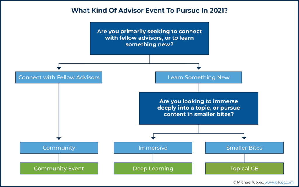 Of course, with the status of the coronavirus still up in the air, it remains uncertain which deep learning events in 2021 will actually be in-person or not. However, advisors can reference the individual conference websites for (likely to be changing and evolving) conference registration information, and Kitces.com also aims to maintain an updated list of each event and its virtual-or-not status for the coming year with our Master Advisor Conference List for 2021.